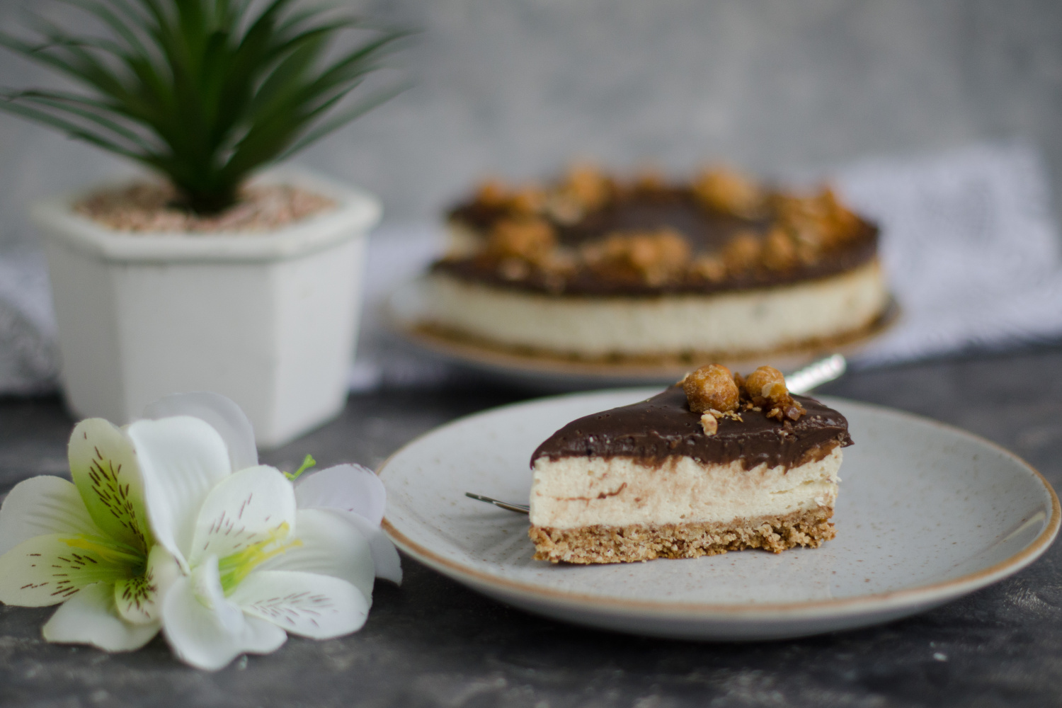 Vločky a orechy spolu pomelieme. Pridáme ryžový sirup alebo med a kokosový olej a vypracujeme lepivú hmotu, ktorú vložíme do formy na pečenie a utlačíme pohárom. Pečieme na 180°C 10 minút. Medzitým si zmiešame tvaroh, vajíčka, kokosové mlieko, orieskové maslo a proteín. Vymiešame a vylejeme na predpečený korpus a pečieme na 160°C asi 45 minút. Vychladnuté polejeme polevou, ktorú si pripravíme tak, že polámanú čokoládu zalejeme zohriatym kokosovým mliekom. Ak chcete naozaj fit dezertík, môžete čokoládovú polevu nahradiť ovocím.